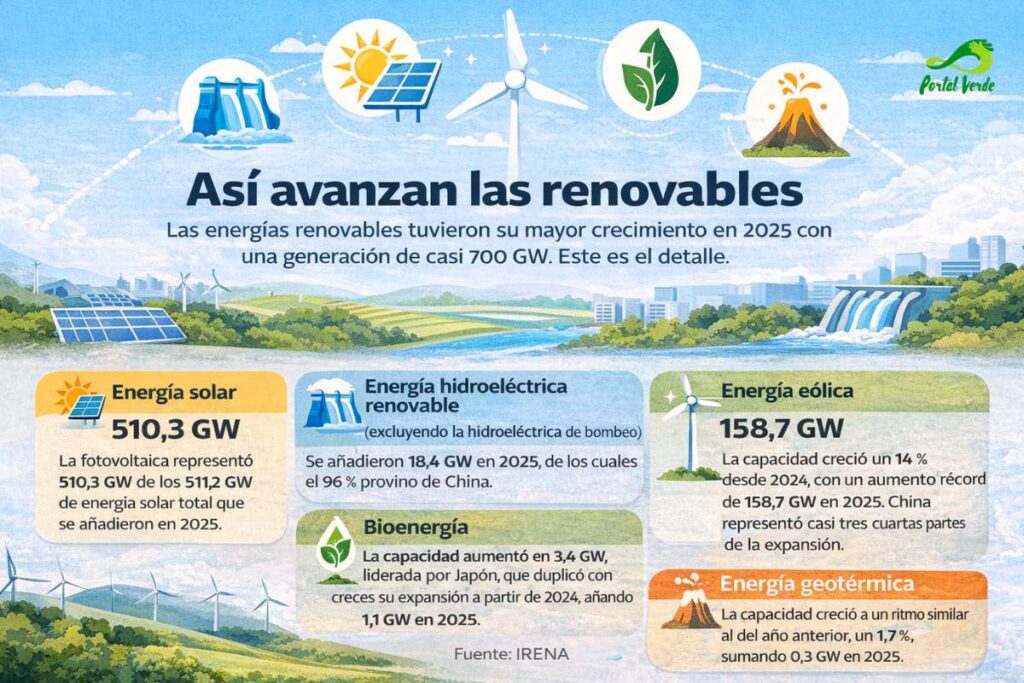 En línea con el año anterior, la energía solar lideró el aumento, con 511 GW, lo que representa aproximadamente el 75 % de la capacidad total añadida a las energías renovables. La energía eólica le siguió, con 159 GW. En conjunto, la energía solar y la eólica representaron el 96,8 % de la capacidad neta añadida a las energías renovables el año pasado, lo que refleja la mayor reducción de costes entre todas las tecnologías renovables. La bioenergía ocupó el tercer lugar con un crecimiento anual del 2,3 %, añadiendo 3,4 GW a la expansión total de las energías renovables.