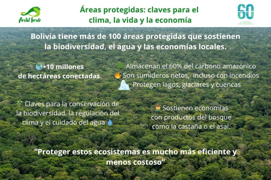 En los últimos años, Bolivia ha logrado conectar un mosaico de más de 10 millones de hectáreas de áreas protegidas nacionales, departamentales, municipales y territorios indígenas, que resguardan su biodiversidad. Allí pone el foco la “Hora del Planeta” este año y, aunque la actividad central será el sábado 28 de marzo, a partir de las 20.30, en los últimos días se han generado diversos espacios para poner en valor estos territorios que, desde la Amazonía hasta los Andes, funcionan como barreras frente al cambio climático, regulan el agua, capturan carbono y sostienen economías locales basadas en el bosque en pie.