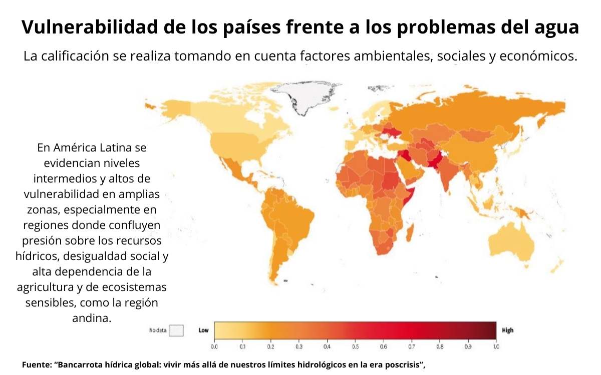 América Latina también está dentro de los patrones globales de agotamiento estructural del capital hídrico, especialmente en zonas donde confluyen alta dependencia de los ecosistemas, presión productiva y efectos acelerados del cambio climático. La situación es especialmente compleja en la región andina, incluyendo a Bolivia.