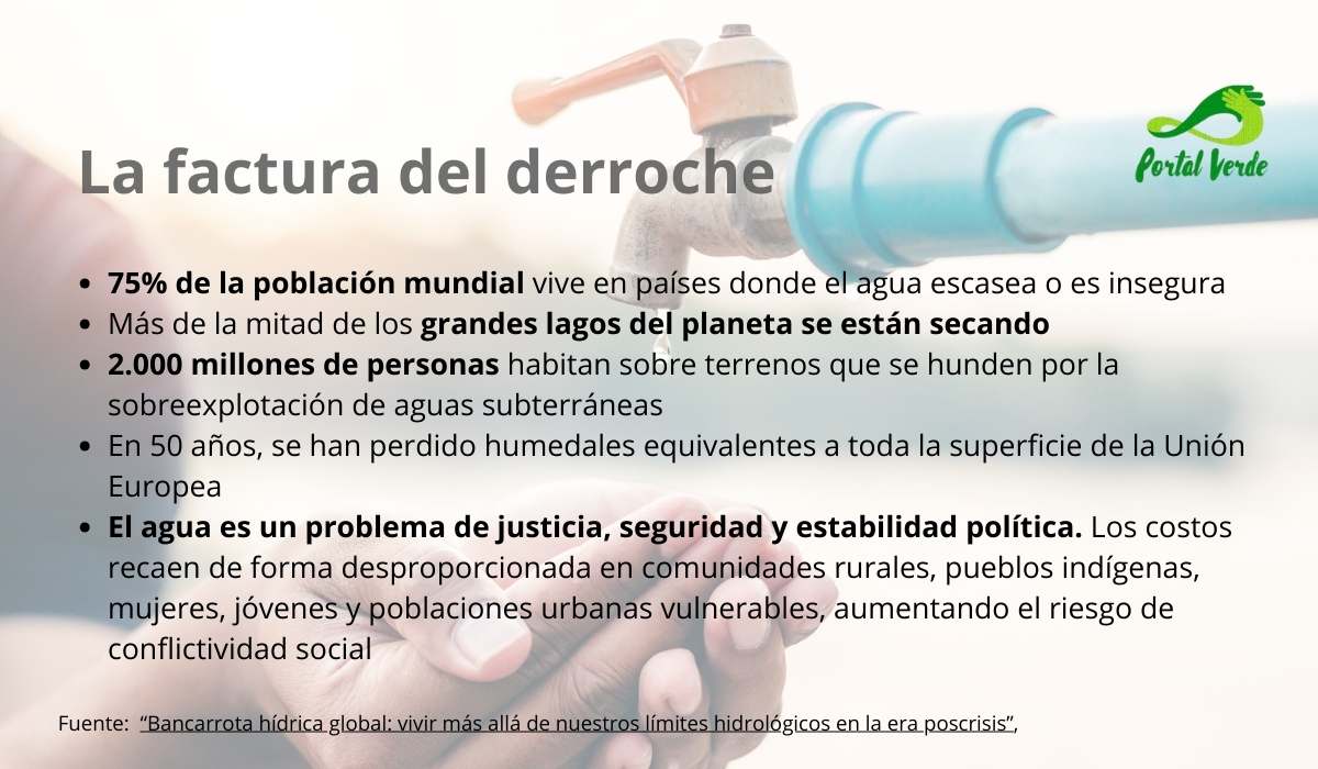 Frente a un escenario aparentemente seco de esperanzas, el informe hace un llamado urgente a la acción: gestionar la quiebra, no la crisis. Esto implica renegociar el contrato con la naturaleza, transformar la agricultura, repartir justamente un recurso menguante y blindar los ecosistemas que aún producen agua.