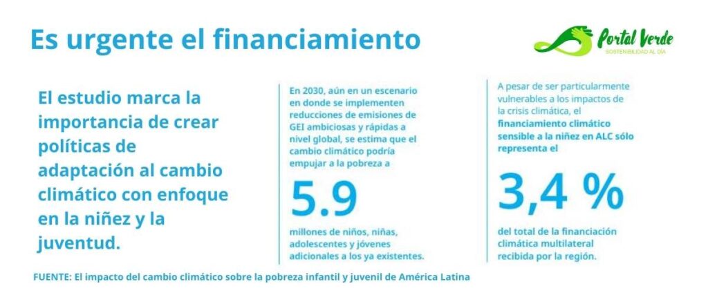 Hoy solo el 3,4% de la financiación climática es dedicada a la niñez en América Latina y el Caribe. Para las agencias, el financiamiento climático no prioriza los servicios de salud, nutrición, educación, agua y saneamiento que la infancia necesita para un óptimo desarrollo cognitivo y físico.