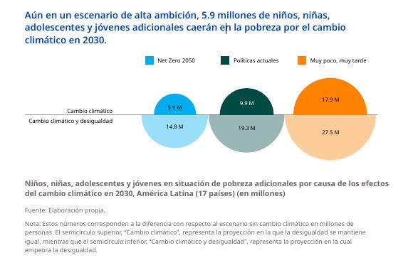 Al menos 5,9 millones de niños y jóvenes de América Latina vivirán en la pobreza para 2030 debido al impacto del cambio climático. La situación puede ser peor, llegar incluso a 17,9 millones, si los países de la región no cumplen sus compromisos de reducción de emisiones de gases de efecto invernadero y si el financiamiento climático no pone foco en este grupo de población.