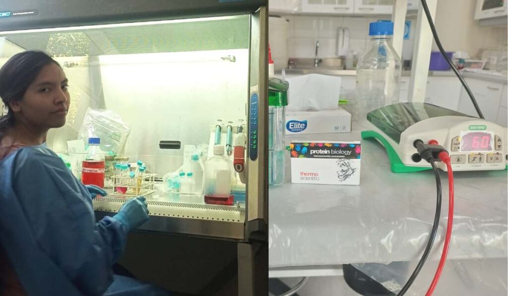 Lorena pasa sus jornadas en un laboratorio, con protocolos y equipamiento de alta especialización. Estudia biotecnología en la Universidad Católica Boliviana de Santa Cruz y por estos días realiza su tesis en la Facultad de Medicina de la Universidad de Chile. Su tesis busca evaluar el fenotipo y la activación de linfocitos T al inhibir el desarrollo de células de cáncer de colon. Es decir: observar qué ocurre si se frena el efecto de una proteína que favorece el desarrollo células cancerígenas, y si eso ayuda a las células defensoras del cuerpo para frenar esta enfermedad.