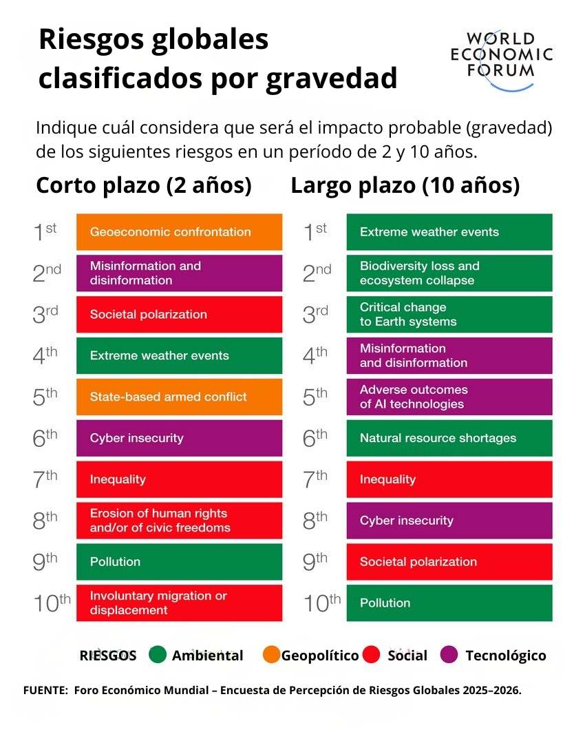 Uno de los hallazgos más relevantes del informe 2026 es la pérdida de prioridad de los riesgos ambientales en el corto plazo. En el horizonte de dos años, la mayoría de estos riesgos desciende tanto en el ranking como en la percepción de gravedad. Los eventos climáticos extremos pasan del segundo al cuarto lugar, la contaminación cae del sexto al noveno, y la pérdida de biodiversidad y el colapso de ecosistemas se desplazan hacia la mitad inferior de la lista